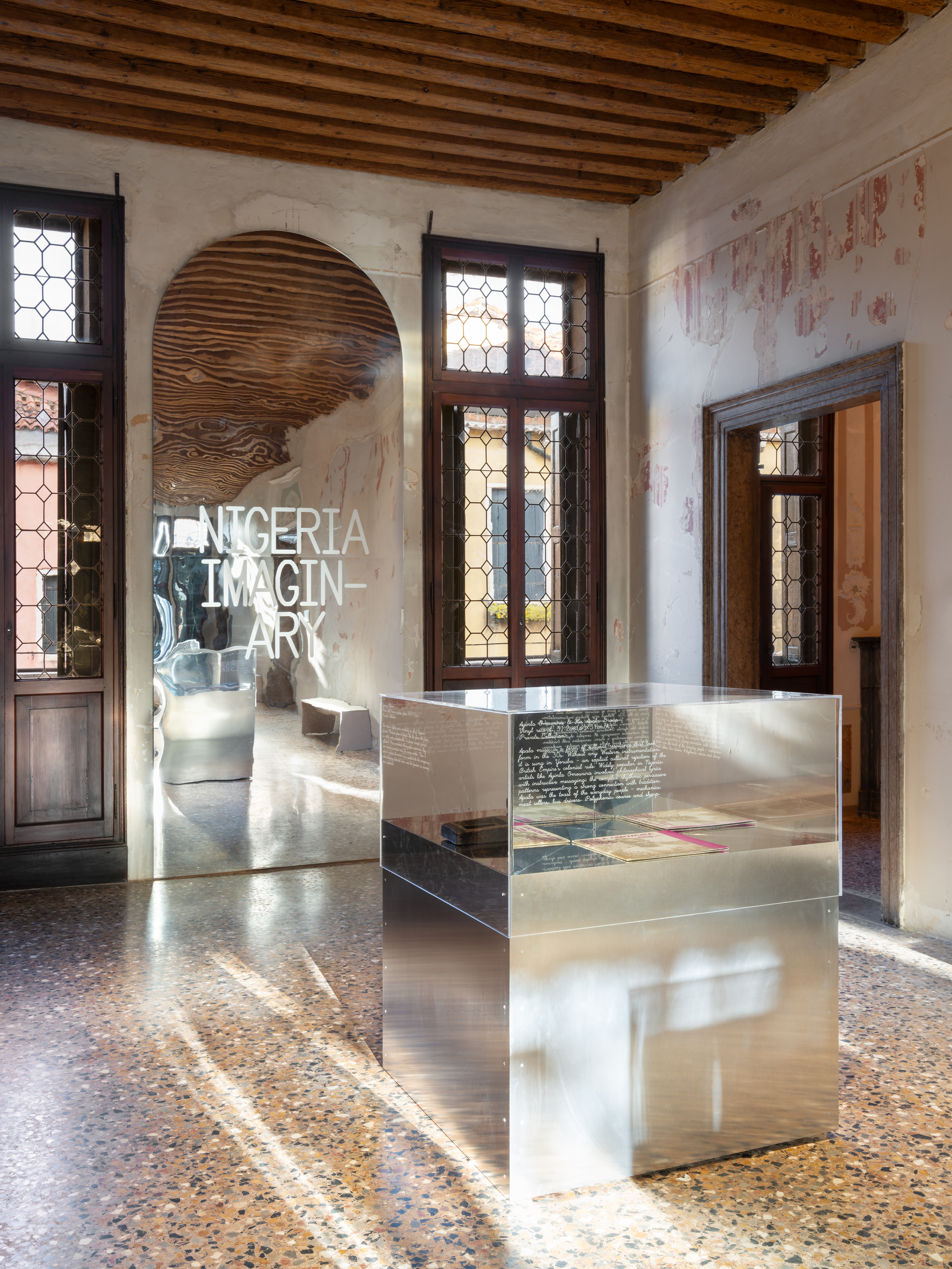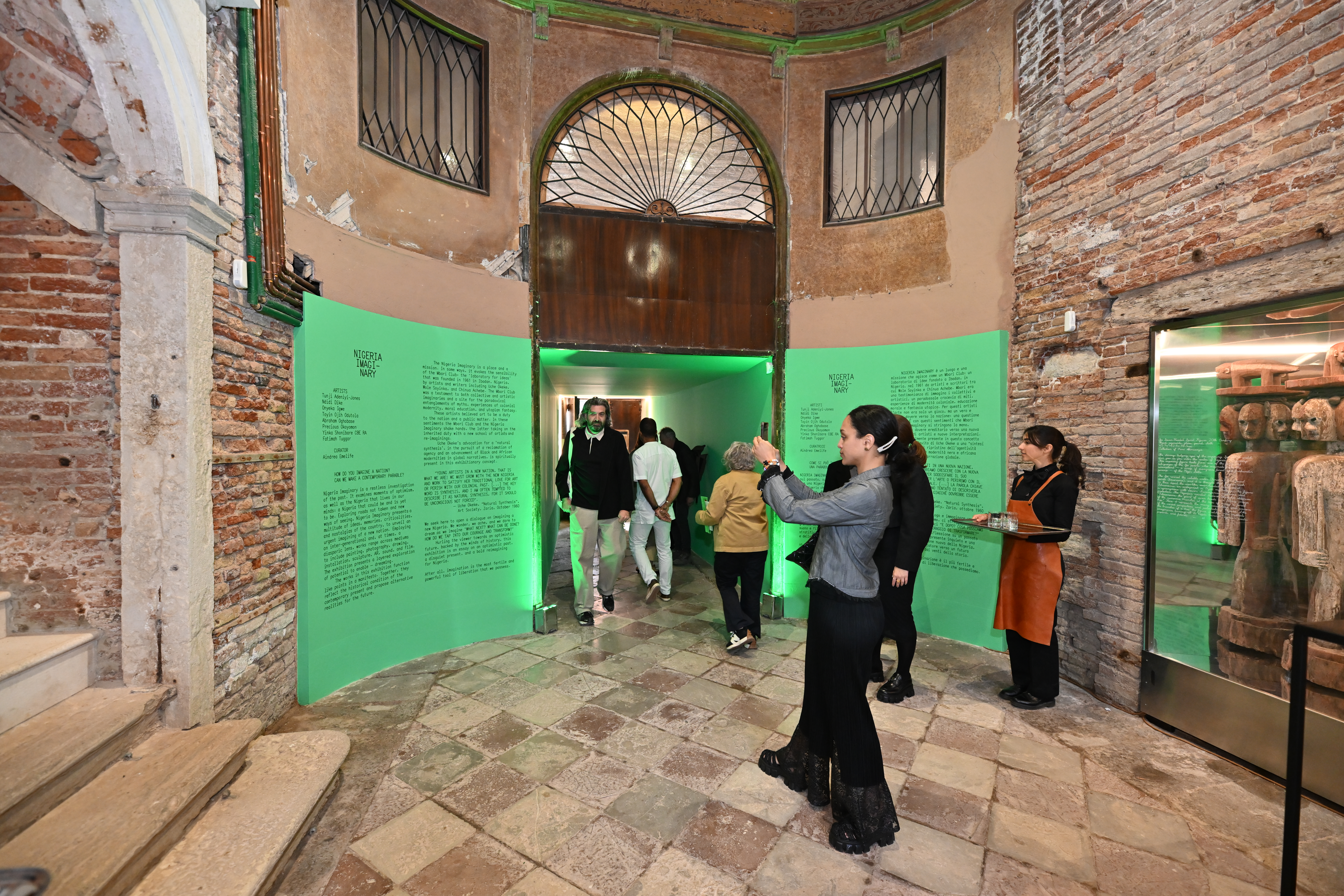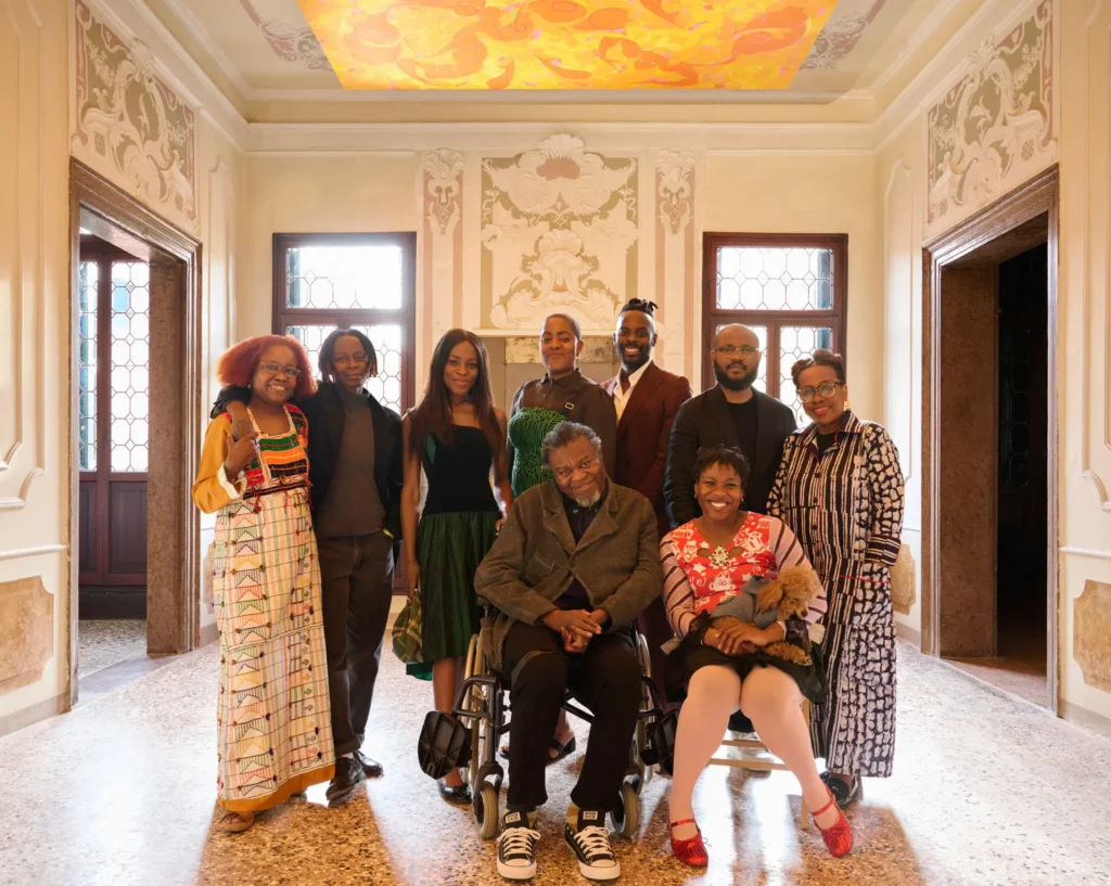 Sited in a historical palazzo in Dorsoduro, near the Gallerie dell’Accademia, this year marked Nigeria’s second time participating in the Venice Biennale. Titled “Nigeria Imaginary,” this year’s exhibition, curated by Aindrea Emelife, featured an intergenerational group of eight Nigerian and Nigerian diasporic artists– Tunji Adeniyi-Jones, Ndidi Dike, Onyeka Igwe, Toyin Ojih Odutola, Abraham Oghobase, Yinka Shonibare CBE RA , Fatimah Tuggar, and Precious Okoyomon.